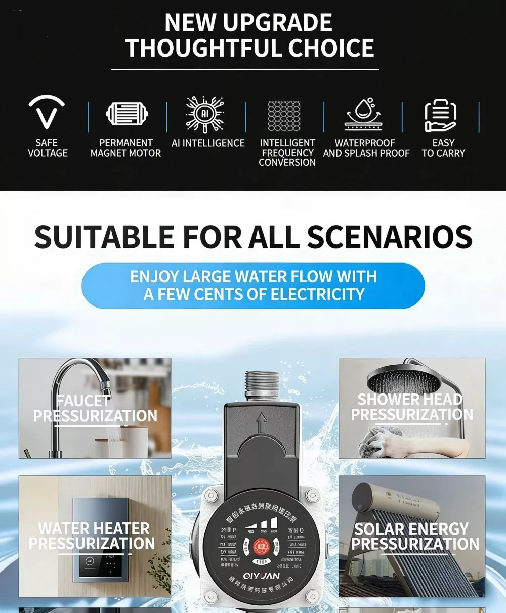 Inteligentna cicha pompa wspomagająca o zmiennej częstotliwości z magnesami trwałymi, ukierunkowana na różne domowe problemy związane z niewystarczającym ciśnieniem wody, w pełni pokrywa następujące podstawowe scenariusze użytkowania: