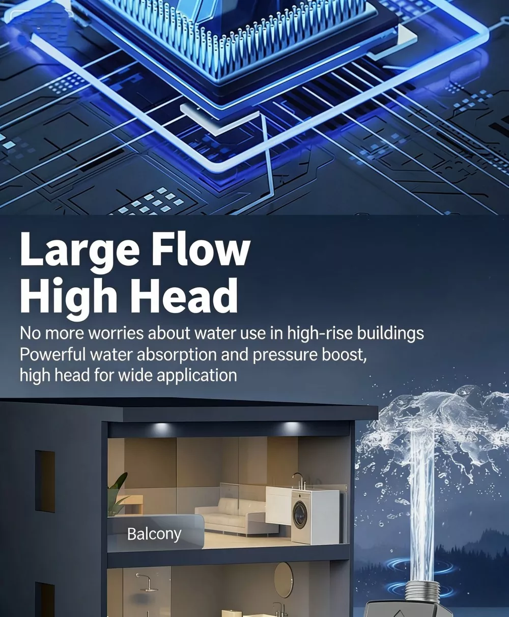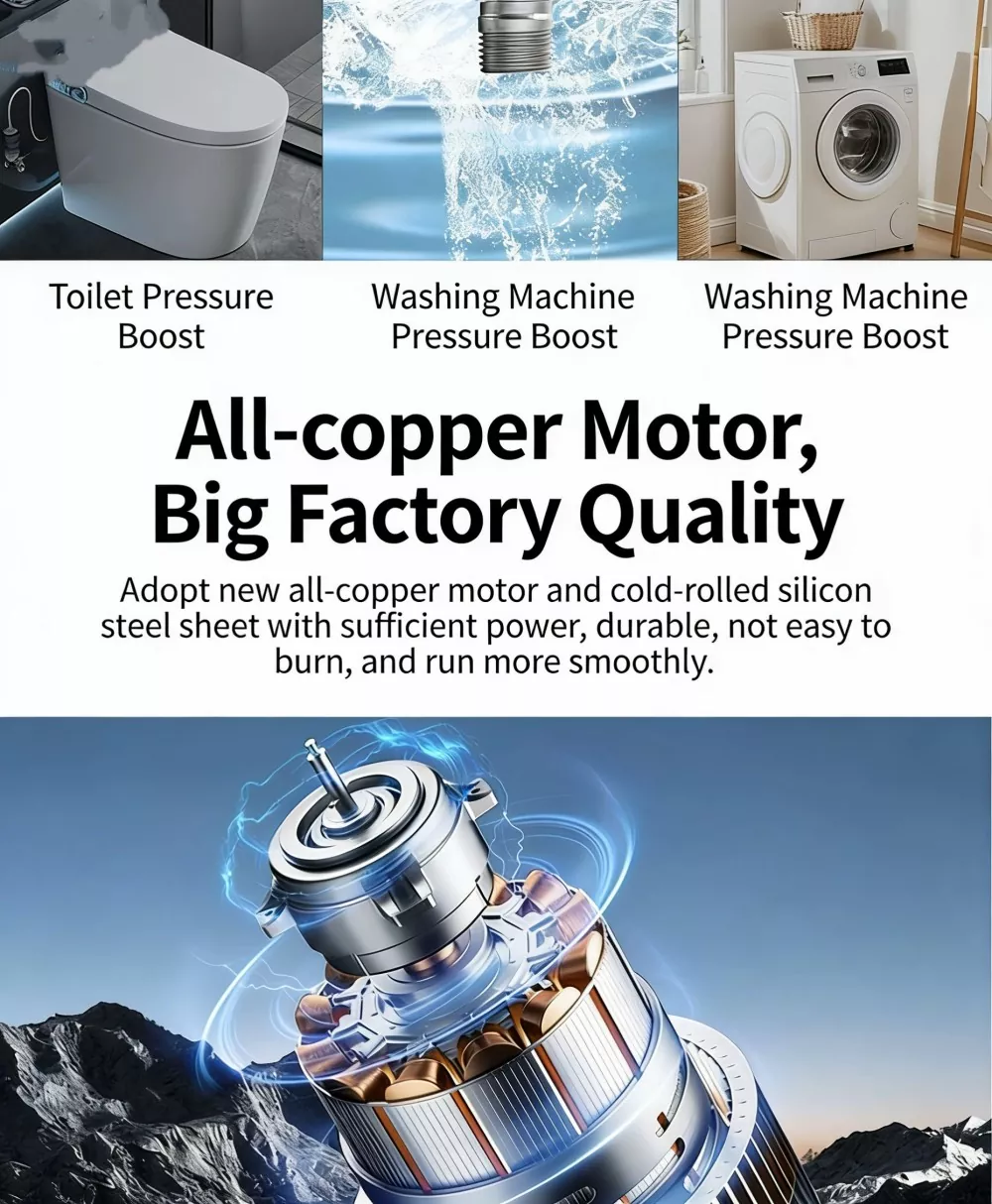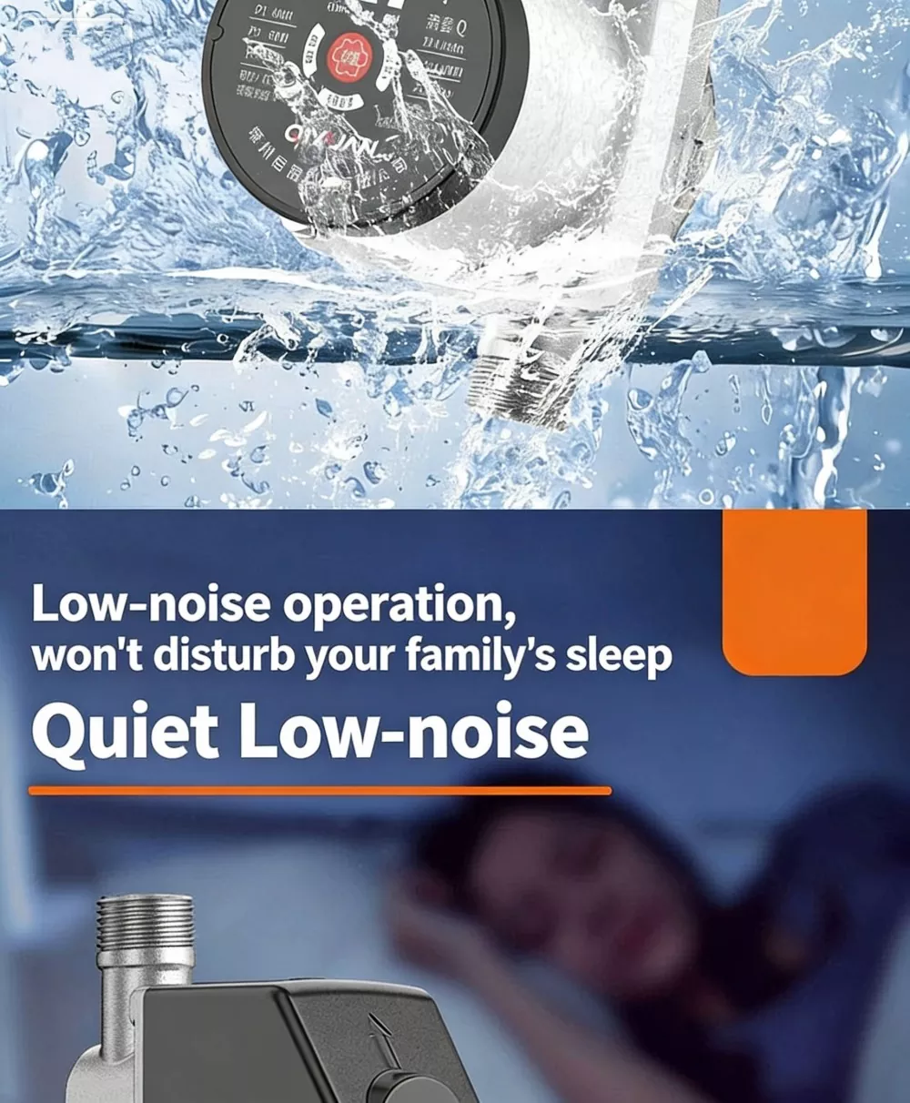 Inteligentna cicha pompa wspomagająca o zmiennej częstotliwości z magnesem trwałym jest wyposażona w zaawansowany system kontroli zmiennej częstotliwości z magnesem trwałym, który automatycznie dostosowuje prędkość silnika do rzeczywistego zapotrzebowania na wodę. W połączeniu z 3 regulowanymi trybami ciśnienia (niski/średni/wysoki) zapewnia stabilne i komfortowe zaopatrzenie w wodę, oszczędzając jednocześnie ponad 30% energii w porównaniu z tradycyjnymi pompami wspomagającymi, skutecznie zmniejszając dzienne zużycie energii.