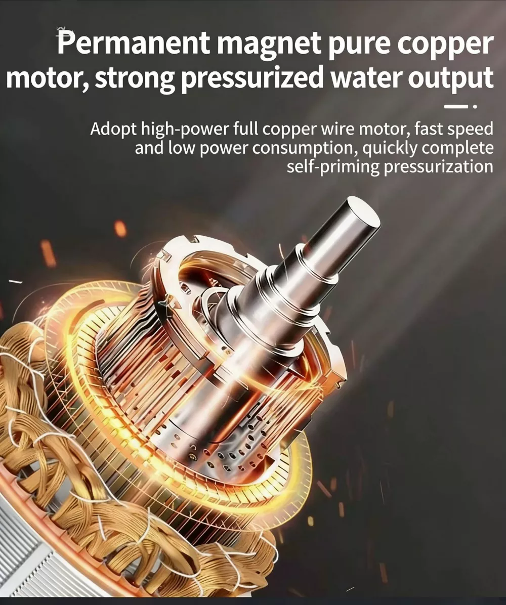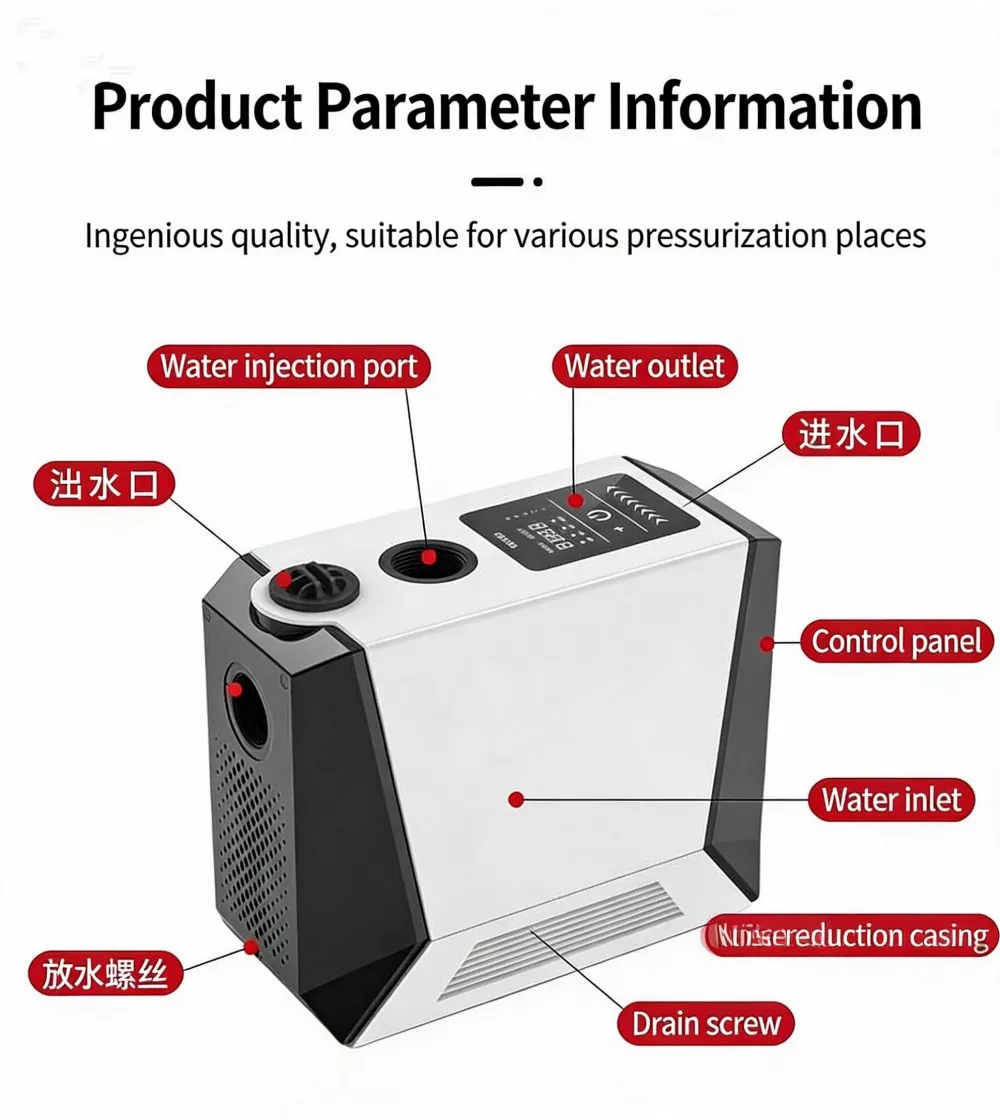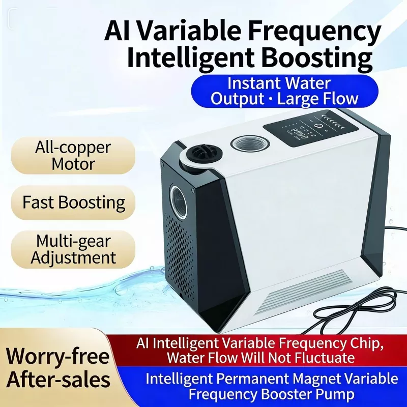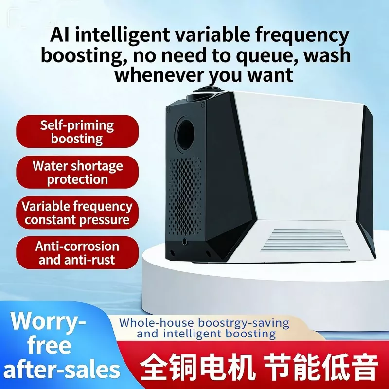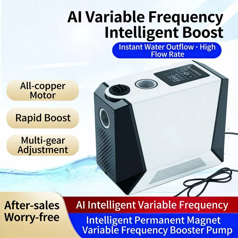 Ta duża, inteligentna pompa wspomagająca, specjalnie zaprojektowana do dużych mieszkań i willi, wykorzystuje zaawansowaną technologię bezszczotkowego silnika z czystej miedzi z magnesami trwałymi w połączeniu z inteligentnym systemem sterowania o zmiennej częstotliwości. Realizuje funkcje automatycznego start-stop i bezstopniowego zwiększania prędkości z wieloma biegami. Wyposażony w cyfrowy wyświetlacz sterujący, charakteryzuje się stylowym wyglądem, niewielkimi rozmiarami i łatwą instalacją. Duża inteligentna pompa wspomagająca doskonale rozwiązuje problem niewystarczającego ciśnienia wody w gospodarstwie domowym, zapewniając stabilne, wydajne i wyjątkowo ciche zaopatrzenie w wodę.