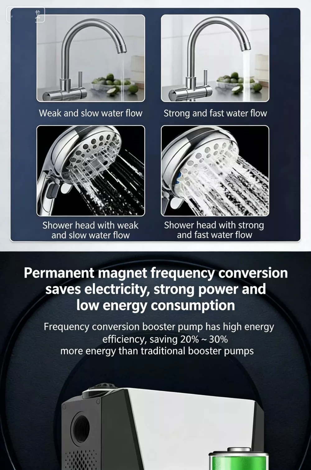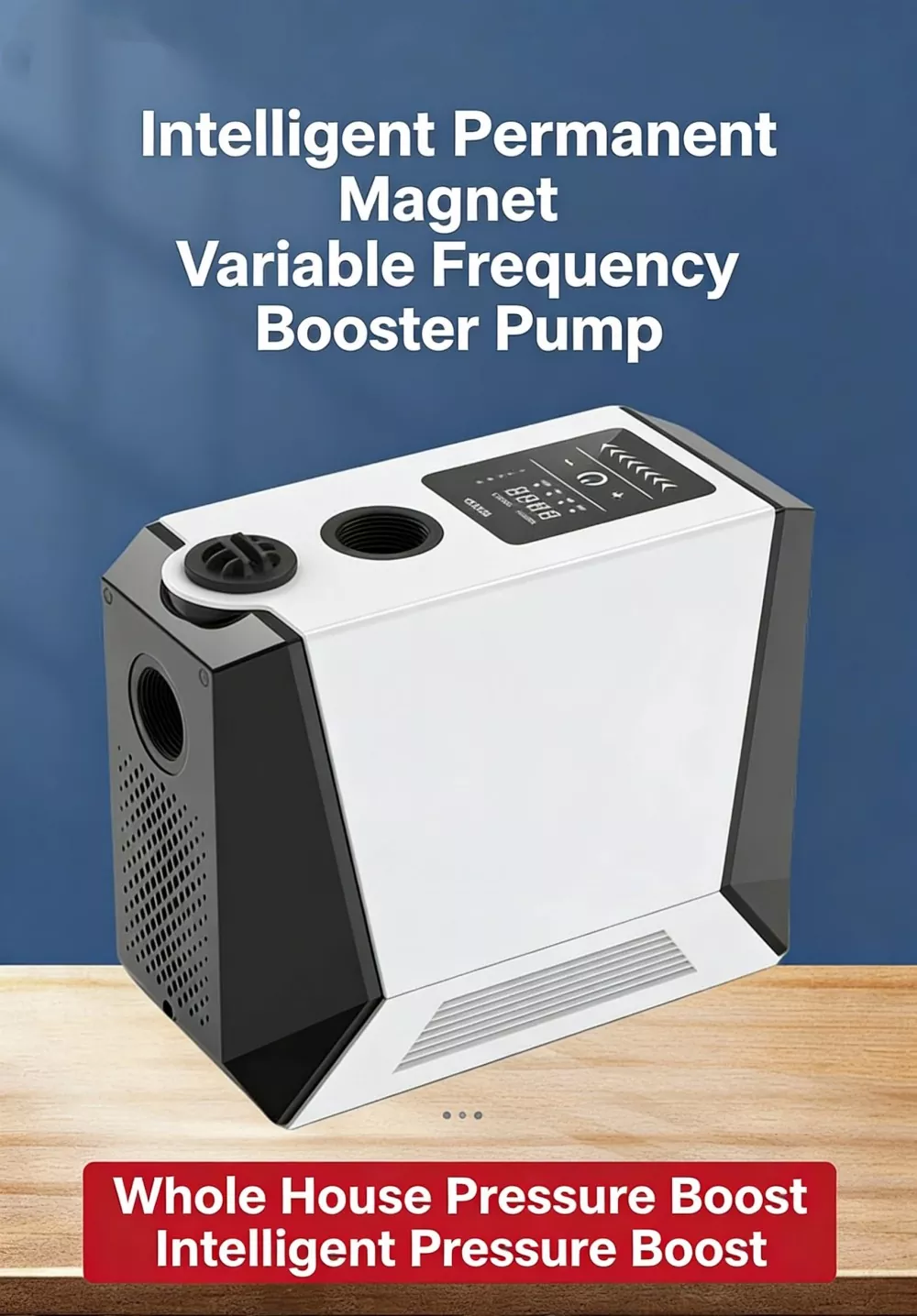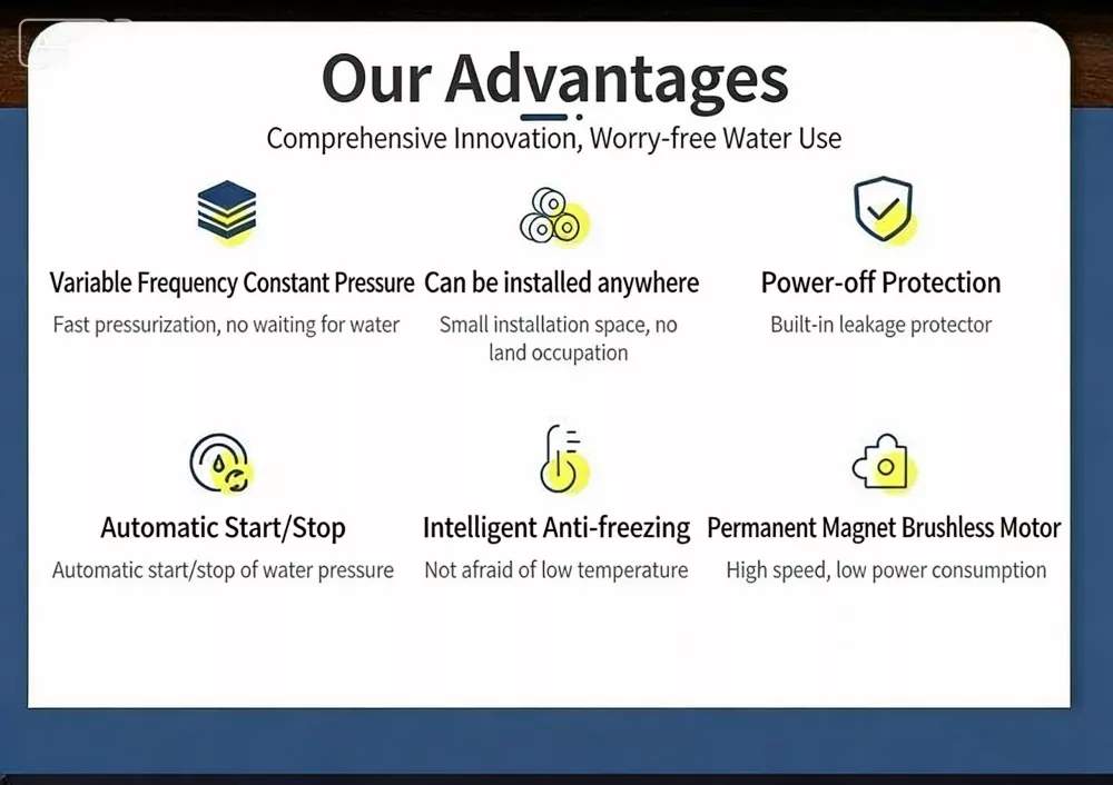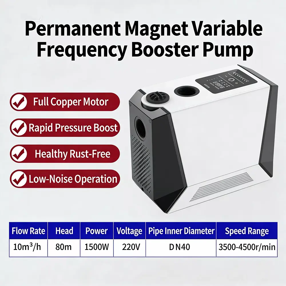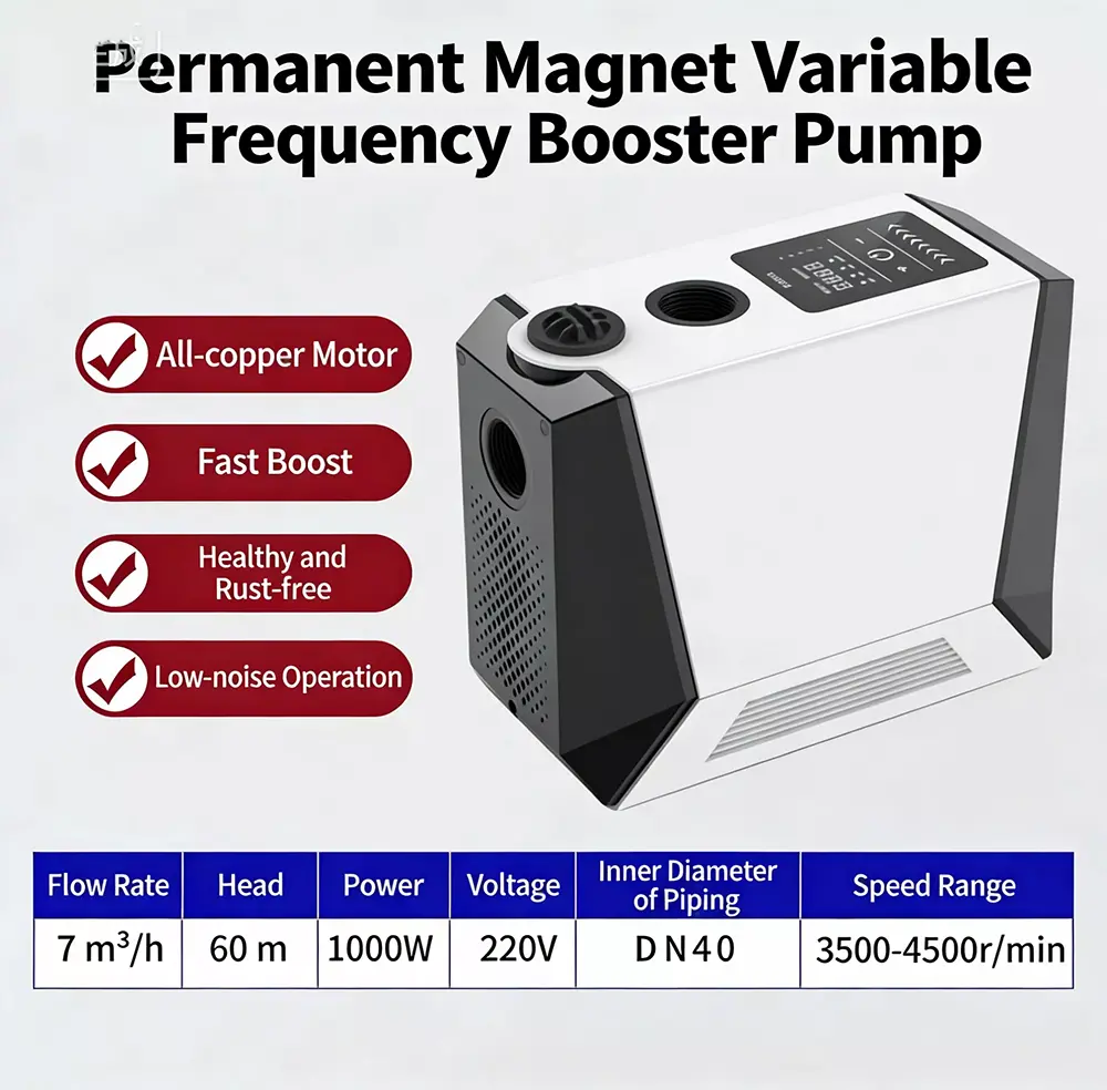 Ta duża, inteligentna pompa wspomagająca, specjalnie zaprojektowana do dużych mieszkań i willi, wykorzystuje zaawansowaną technologię bezszczotkowego silnika z czystej miedzi z magnesami trwałymi w połączeniu z inteligentnym systemem sterowania o zmiennej częstotliwości. Realizuje funkcje automatycznego start-stop i bezstopniowego zwiększania prędkości z wieloma biegami. Wyposażony w cyfrowy wyświetlacz sterujący, charakteryzuje się stylowym wyglądem, niewielkimi rozmiarami i łatwą instalacją. Duża inteligentna pompa wspomagająca doskonale rozwiązuje problem niewystarczającego ciśnienia wody w gospodarstwie domowym, zapewniając stabilne, wydajne i wyjątkowo ciche zaopatrzenie w wodę.