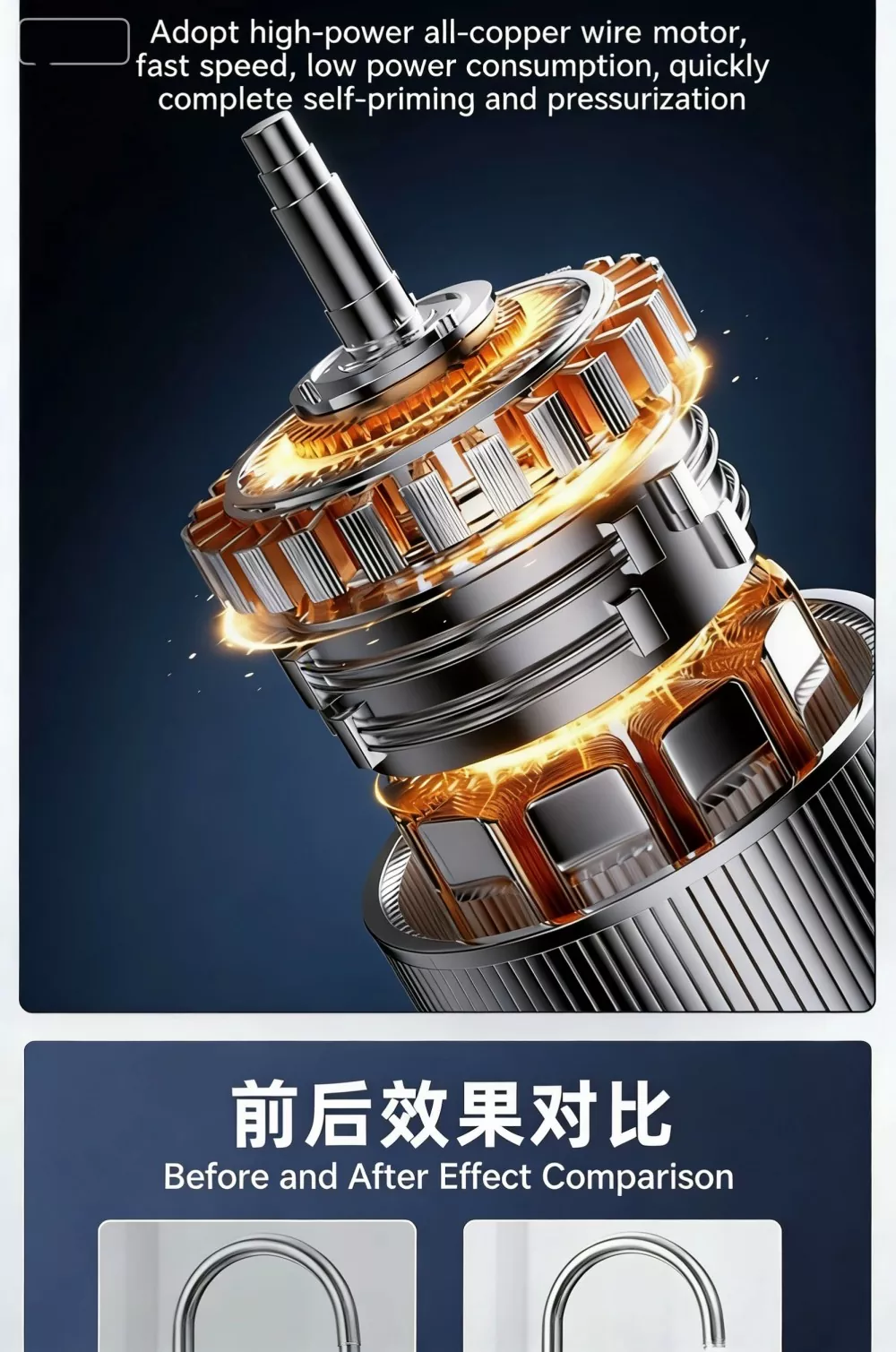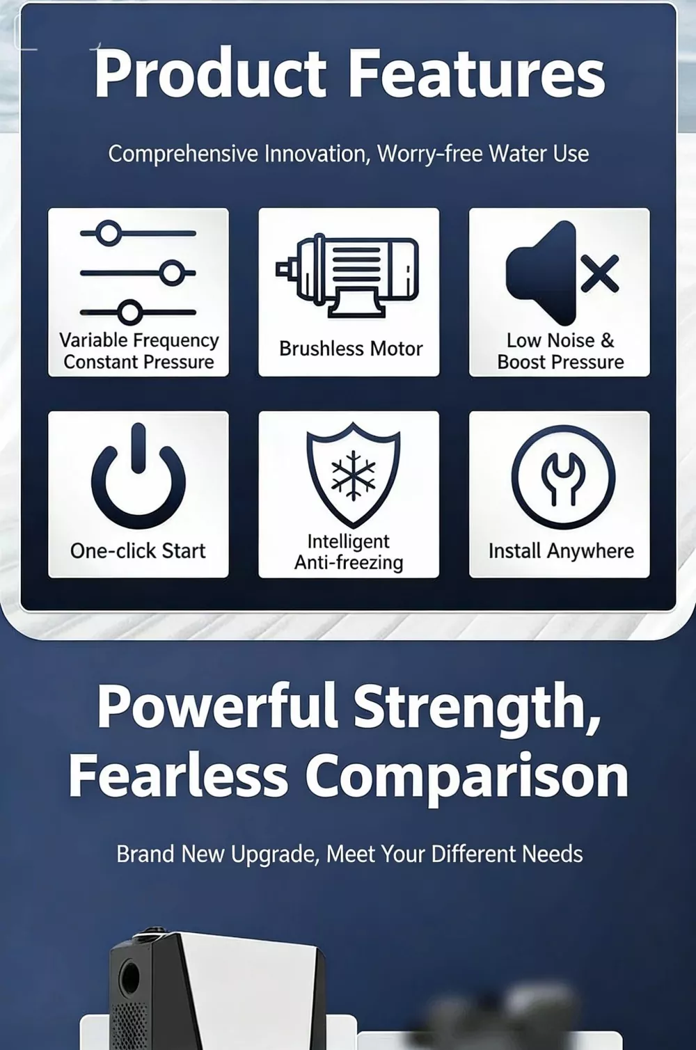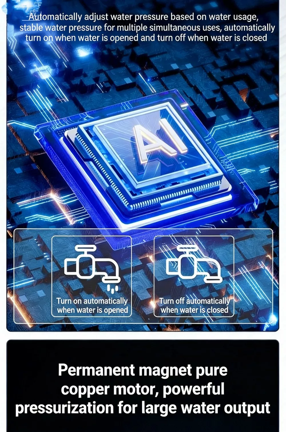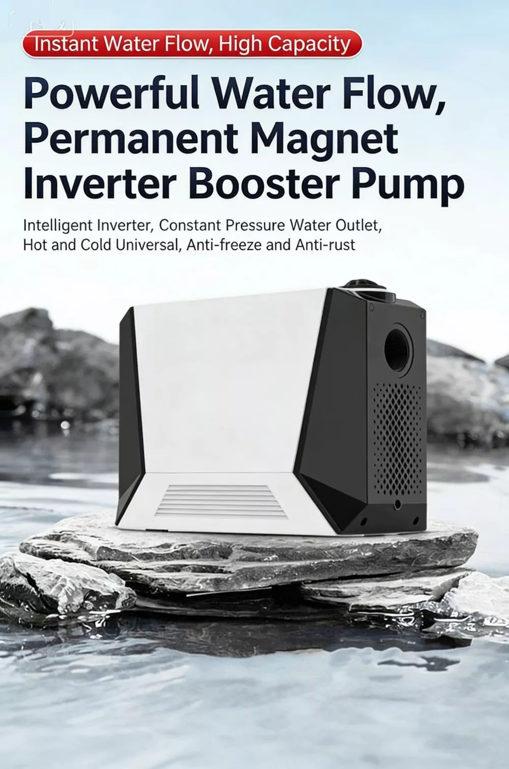 Ta duża, inteligentna pompa wspomagająca, specjalnie zaprojektowana do dużych mieszkań i willi, wykorzystuje zaawansowaną technologię bezszczotkowego silnika z czystej miedzi z magnesami trwałymi w połączeniu z inteligentnym systemem sterowania o zmiennej częstotliwości. Realizuje funkcje automatycznego start-stop i bezstopniowego zwiększania prędkości z wieloma biegami. Wyposażony w cyfrowy wyświetlacz sterujący, charakteryzuje się stylowym wyglądem, niewielkimi rozmiarami i łatwą instalacją. Duża inteligentna pompa wspomagająca doskonale rozwiązuje problem niewystarczającego ciśnienia wody w gospodarstwie domowym, zapewniając stabilne, wydajne i wyjątkowo ciche zaopatrzenie w wodę.
