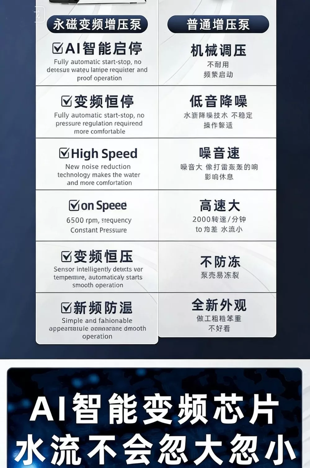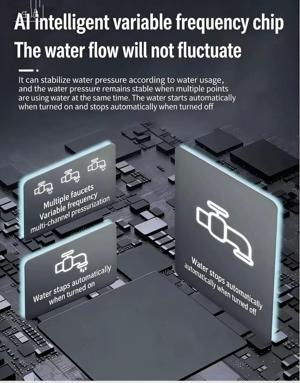 Wbudowany inteligentny system sterowania obsługuje automatyczny start i stop. Automatycznie dostosowuje prędkość obrotową do zapotrzebowania na wodę z 6-stopniową bezstopniową regulacją prędkości, aby utrzymać stabilne ciśnienie wody. Proste i elastyczne dostosowanie do rzeczywistych potrzeb użytkowych.