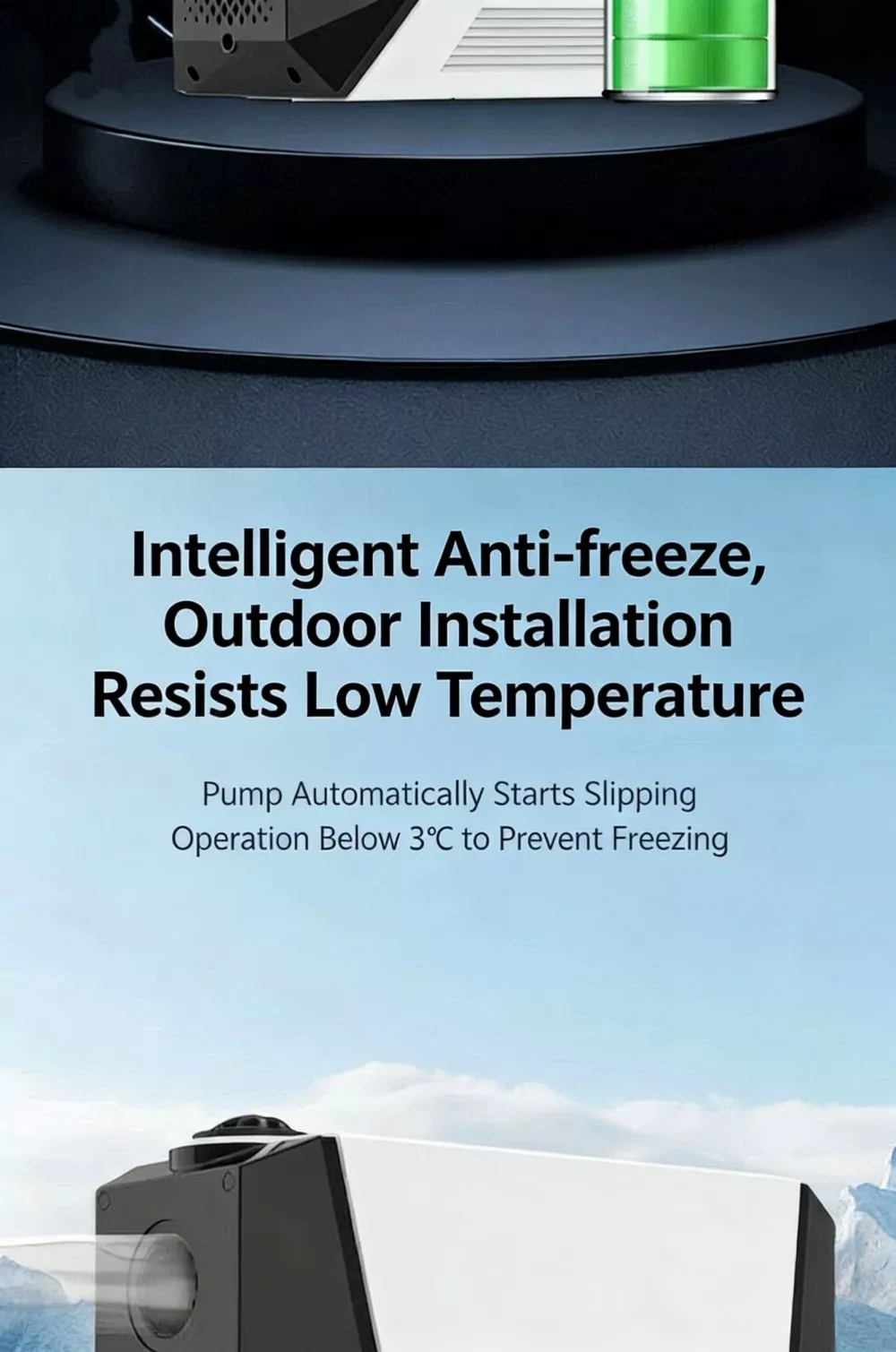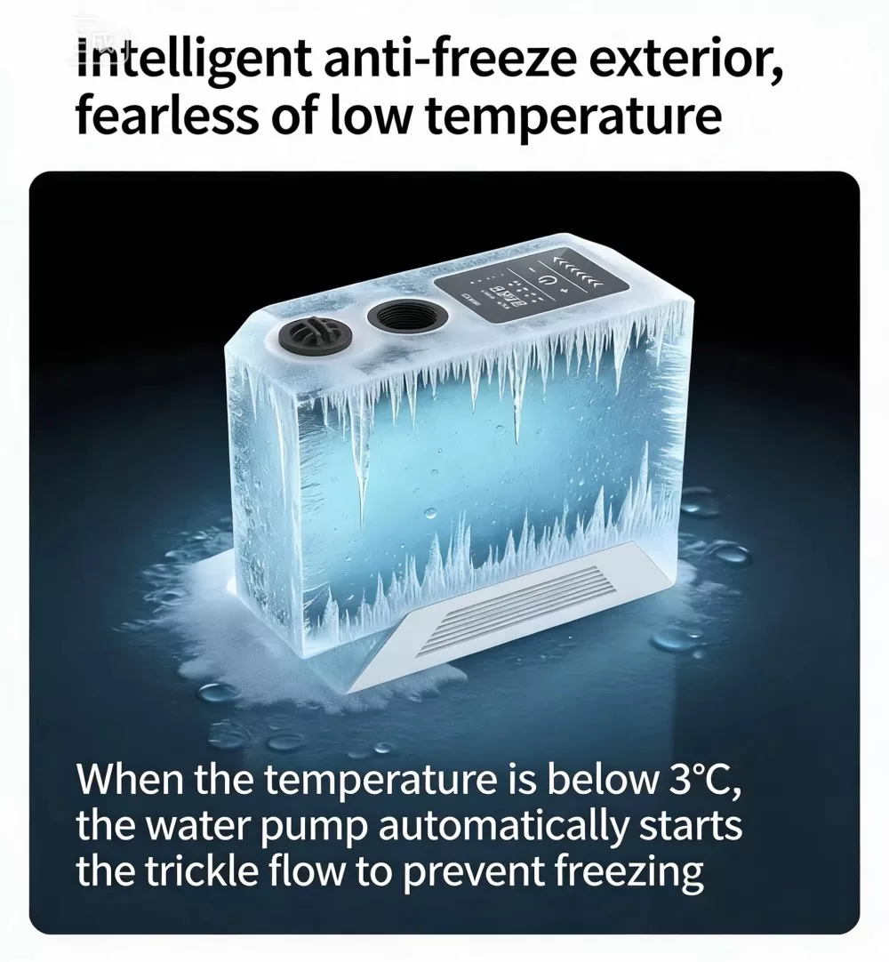 Wbudowany inteligentny system ogrzewania przeciwzamrożeniowego włącza się automatycznie, gdy temperatura otoczenia spadnie poniżej -3°C, zapobiegając pękaniu pompy w niskich temperaturach i wydłużając żywotność sprzętu, co jest idealne w zimnych regionach.