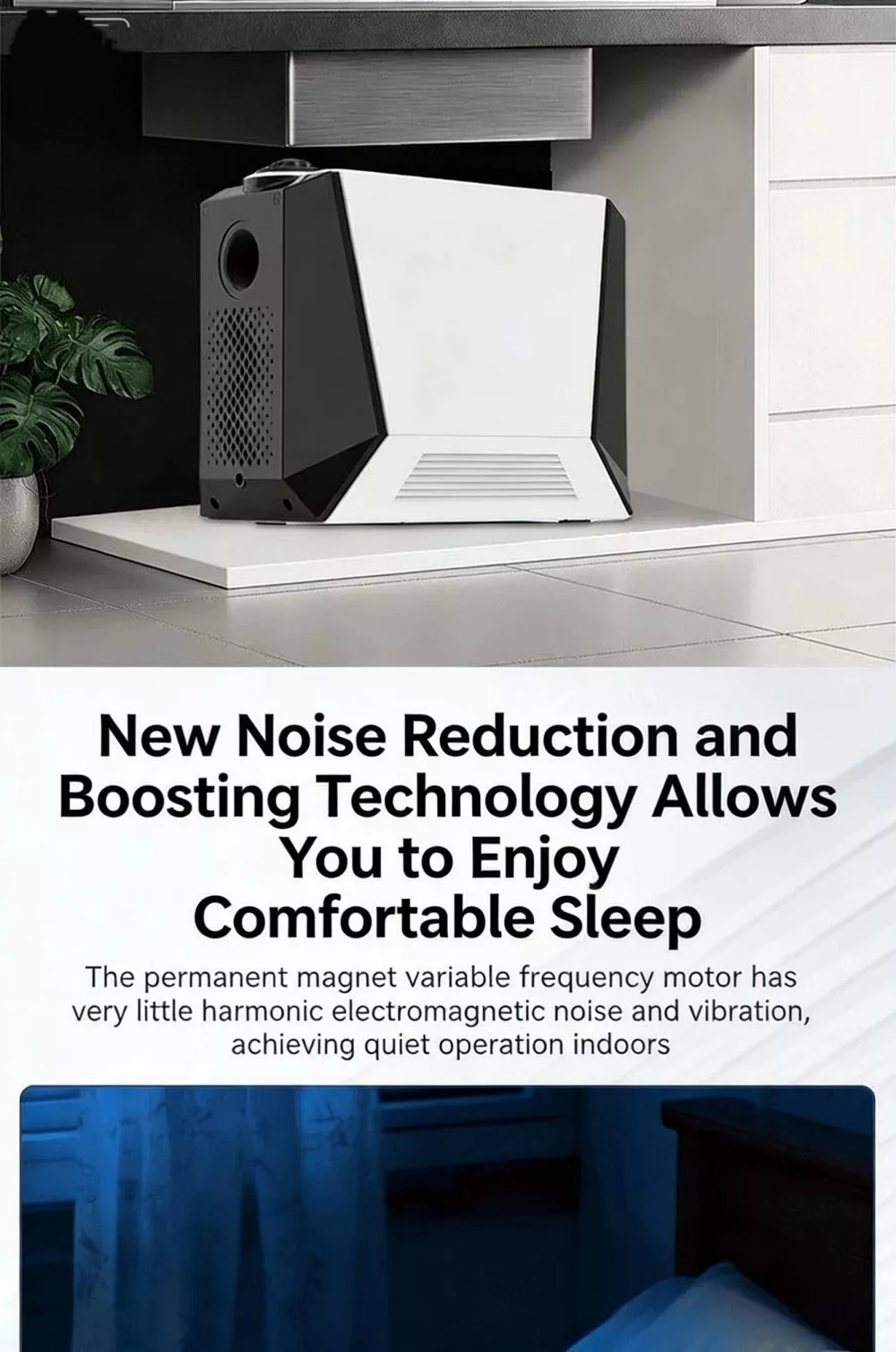 Wykorzystuje wysokiej jakości bezszczotkowy silnik z czystej miedzi z magnesami trwałymi, charakteryzujący się wysoką efektywnością energetyczną, długą żywotnością i stabilną pracą. W porównaniu z tradycyjnymi silnikami efektywność energetyczna jest lepsza o ponad 30%, zmniejszając zużycie energii i koszty operacyjne.